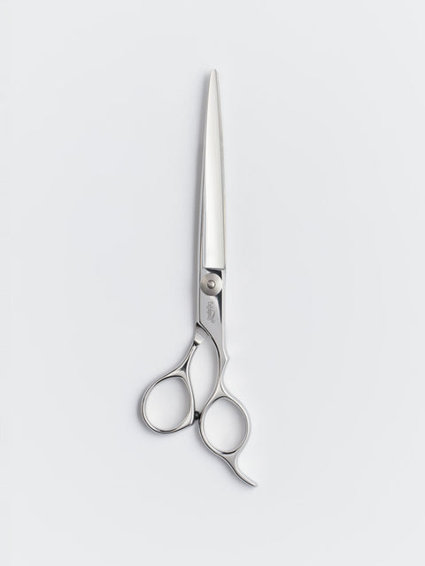 A traditional Japanese style scissor with short handle shanks and elongated blades. An excellent barbering scissor.